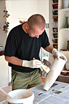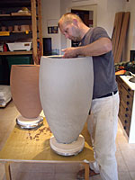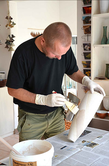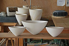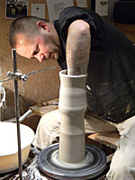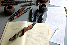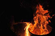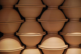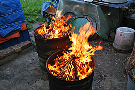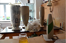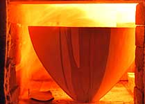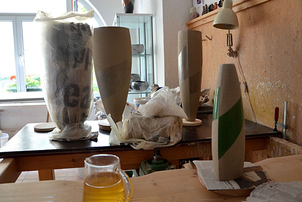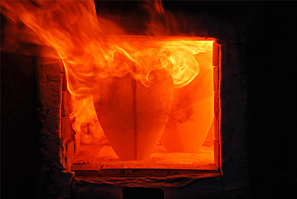 Bereits im Studium bauten wir Heiligendammer Studenten einen ersten Rakuofen...jetzt, viele Jahre später, brennen wir unserer Rakukeramik außerhalb Jenas auf einem kleinen Scheunengrundstück. Von hier geht der Blick weit ins Tal der Ilm und über die südöstlichen Ausläufer der Finne hinweg bis zum Kyffhäuser hinüber. Wir erleben es immer wieder als eine bereichernde Erfahrung mit Feuer als »Werkzeug« arbeiten zu dürfen. |